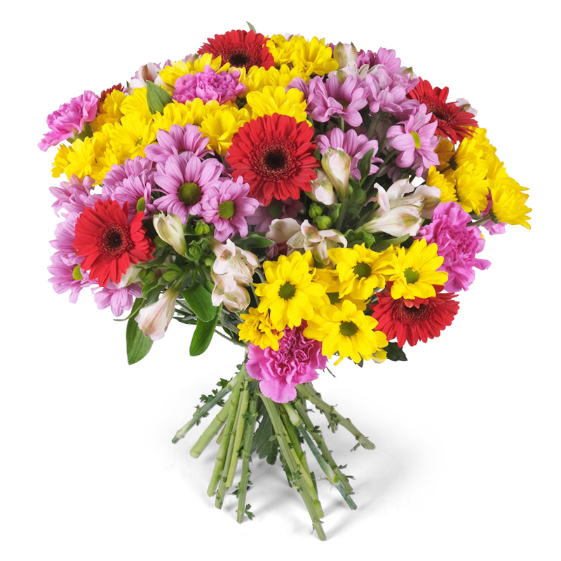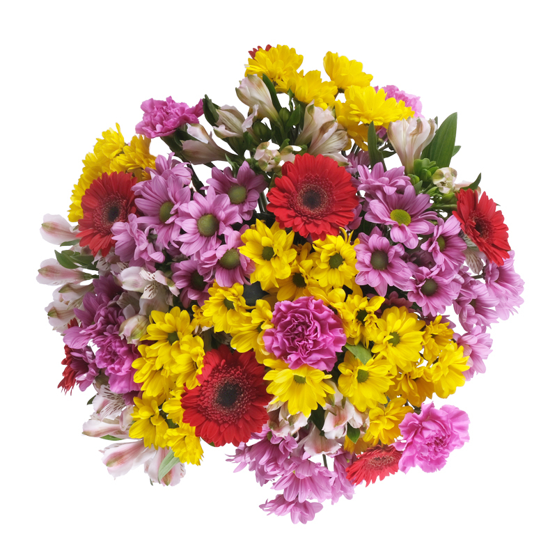 Zawsze świeże kwiaty Kwiaty dla kogoś, kto nie boi się być w centrum uwagi. Gerbery, santini, goździki i alstromerie mieszają się w spektakularną kompozycję pełną energii. Bogactwo gatunków to gwarancja długiej świeżości, a efektowna forma sprawia, że bukiet naprawdę robi wrażenie.